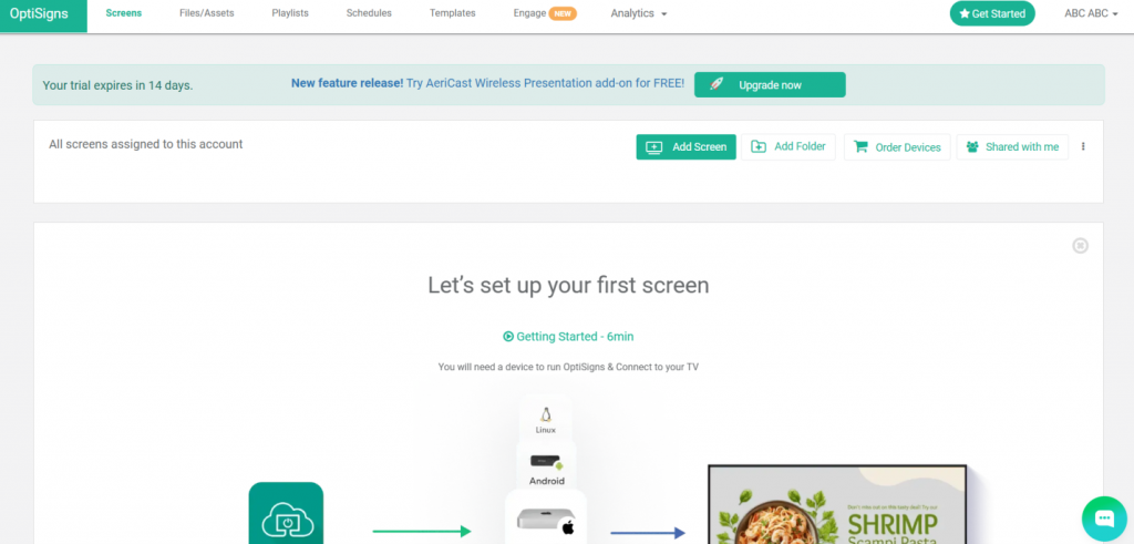 - The dashboard displays a prompt to set up your first screen if no devices are connected yet. This helps new users quickly get started.