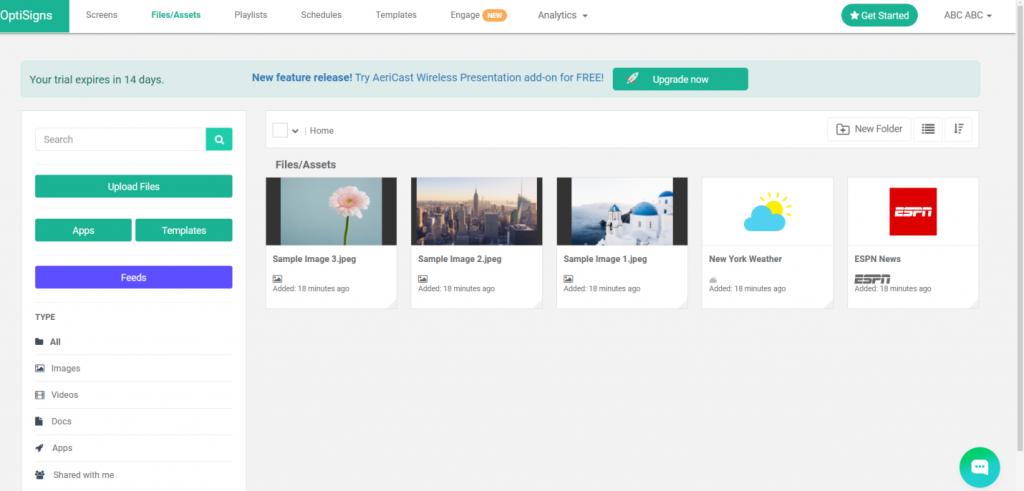 The Files/Assets tab in OptiSigns is your central location for managing and organizing the media content you want to use in your LED display ads. Here’s a detailed breakdown of what you can do in this section, as shown in the screenshot: