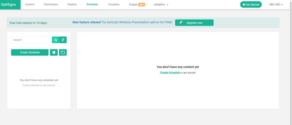 The Schedules tab in OptiSigns allows users to create and manage schedules for displaying content. You can create a schedule to determine when and where specific content, such as playlists or individual files, will appear on connected screens. Since the screen shows “You don’t have any content yet,” it seems no schedules have been created yet. To get started, click on the Create Schedule button. This will guide you through setting up a new schedule with time slots, days, and assigned content.