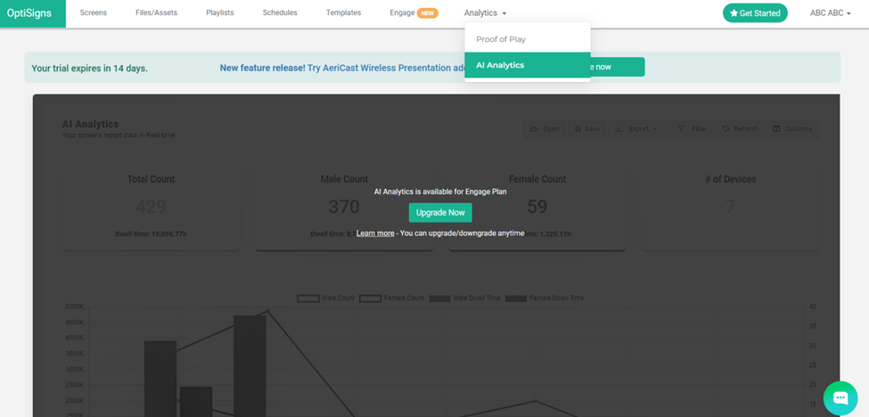 - AI Analytics: Offers detailed data like gender-specific counts (e.g., Male and Female Counts), total dwell time, and the number of devices reporting. This is available as part of the Engage Plan, requiring an upgrade.