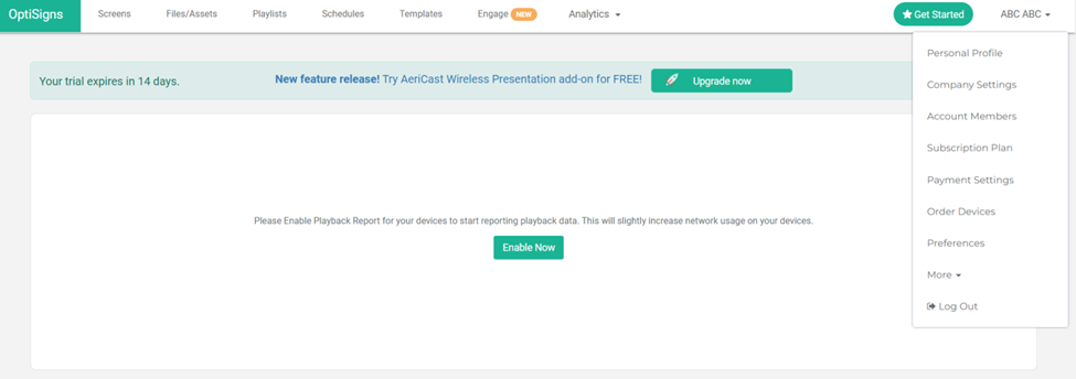 Once you log in, you’ll arrive at the OptiSigns dashboard. This is your starting point for managing screens, uploading content, and scheduling ads. The interface is clean and user-friendly, with all essential features accessible from the top navigation bar.