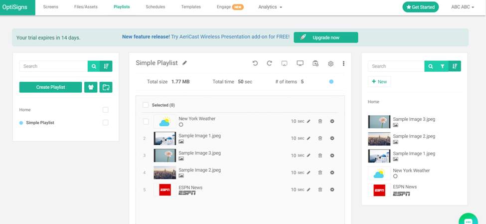 - Playlists: Group content into playlists for smoother scheduling.